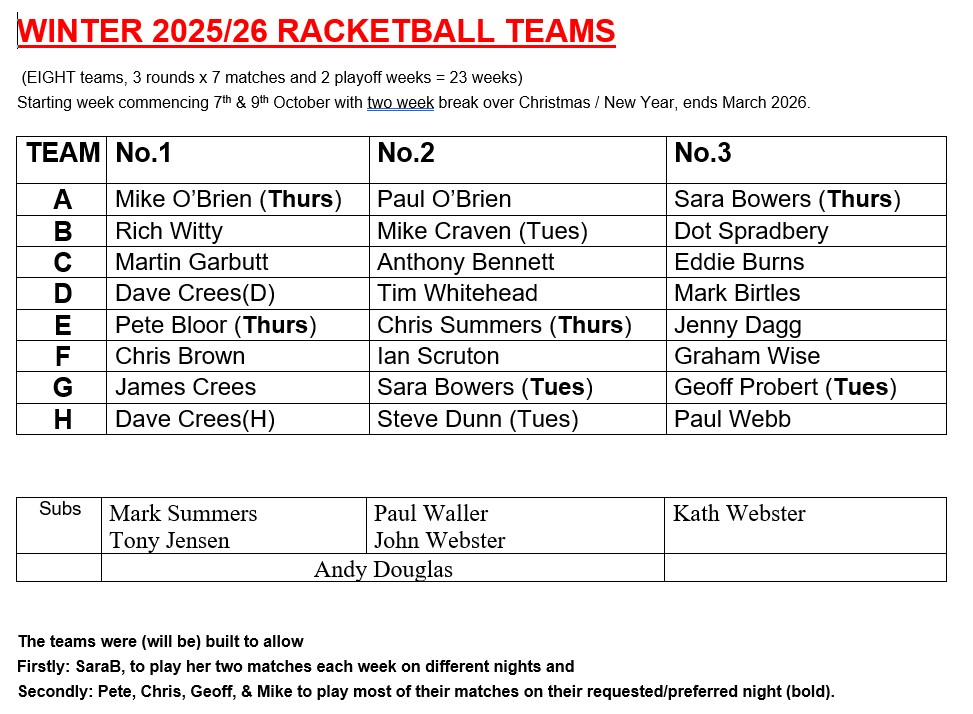 2025/2026 Winter Racquetball League The Club runs leagues which take place twice a year. Matches consist of a five minute knock-up, then twenty five minute non stop using American scoring, with a playoff at the end of the season. Result Input 2025 Winter TEAMS for 2025/26 WINTER FIXTURES for 2025/26 Winter